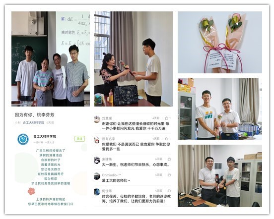 在活动中,同学们围绕教师节感恩主题,精心准备,开展内容丰富、形式多样诚挚的祝福活动,表达同学们对广大教师的热爱和关怀。在教学楼、办公室和实验室,同学们为老师们送上鲜花和精心制作的贺卡,将自己对老师的心意浓缩成一段段文字和一幅幅图画,表达材料学子对老师们辛勤付出的感激之情,感谢老师们在学习上传道解惑,生活上的关心爱护,心灵上的疏导关爱。