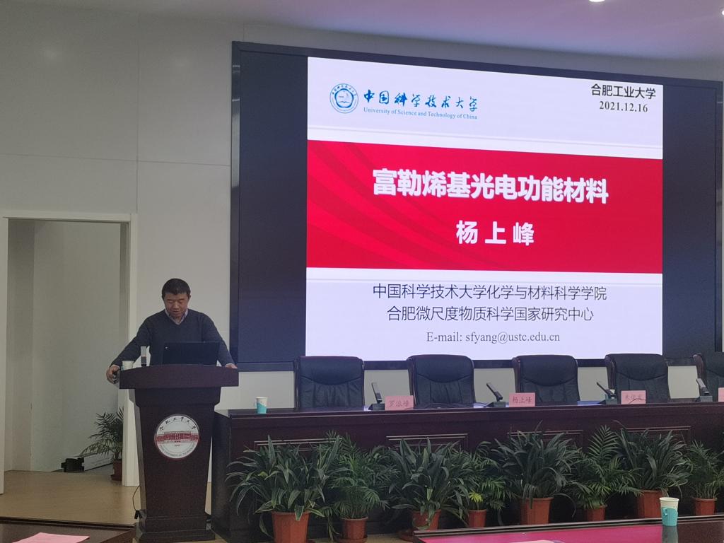 会上,吕珺对杨上峰教授的到来表示热烈的欢迎,并介绍了其个人突出事迹。杨上峰教授予2003年在香港科技大学获博士学位,长期从事富勒烯功能材料和新型太阳能电池的研究,目前的主要研究方向是新型碳纳米材料的合成及在钙钛矿太阳能电池中的应用。迄今为止已在包括Nature Commun.,Adv. Mater., Angew. Chem. Int. Ed., J. Am. Chem. Soc.等国际学术期刊上发表论文300余篇。获得中国科学技术大学校友基金会“优秀青年教师奖”、中国科学院“优秀导师奖”、中国科学院“朱李月华优秀教师奖”等多项荣誉。