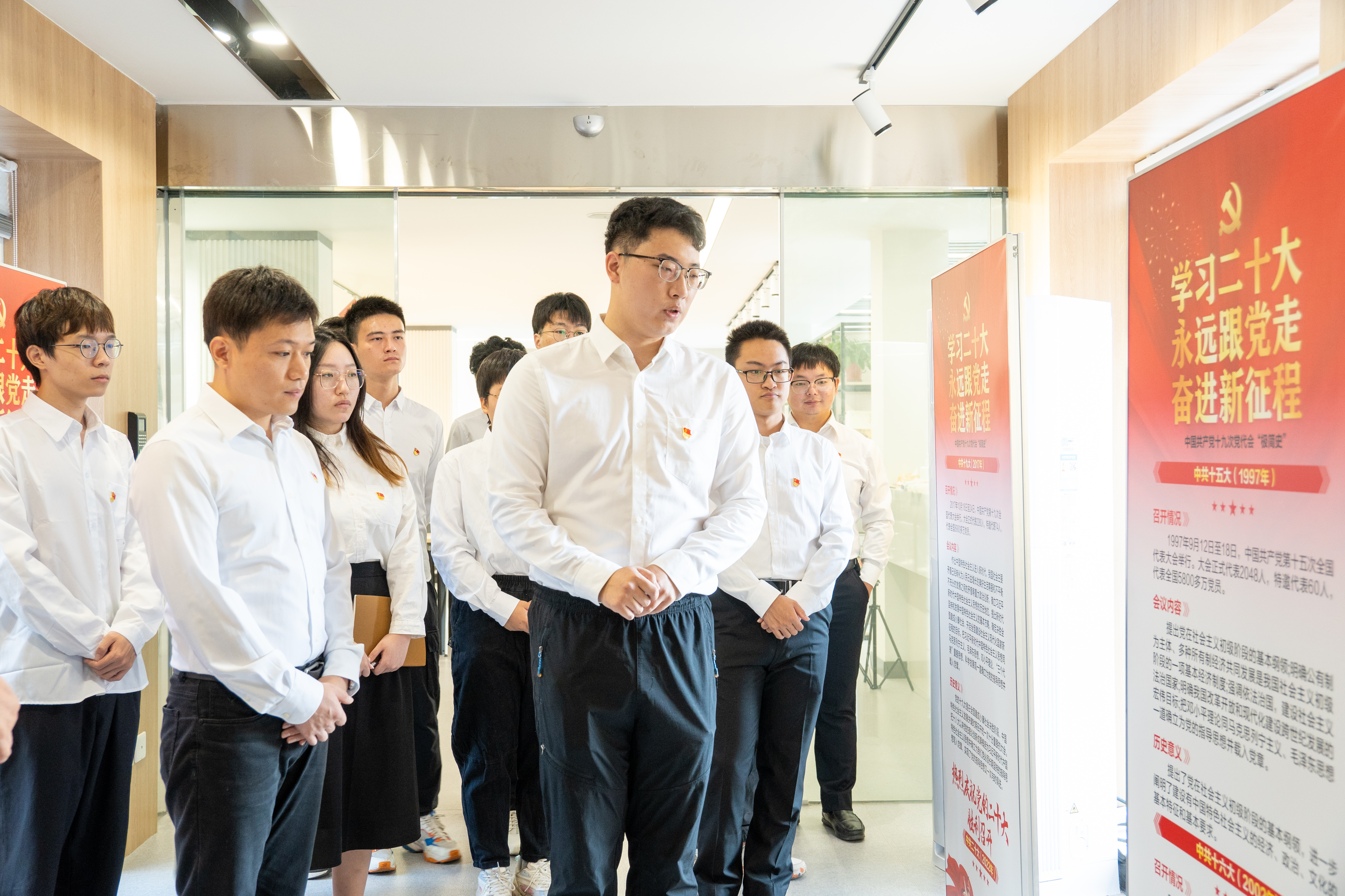 活动中,同学们身着白色衬衫、佩戴党员徽章,精神抖擞地来到社区二楼空间,参观了中国共产党历次全国代表大会“极简史”展览,认真学习历次党代会召开情况、主要内容和历史意义,通过历次党代会的党史微故事,更加全面、深刻地学习党史。