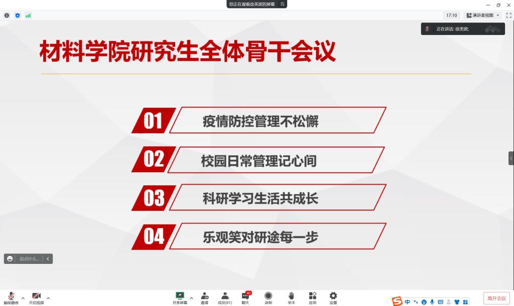 会上,研究生辅导员向同学们介绍了当前疫情防控工作形势,传达了学校疫情防控工作精神及近期疫情防控相关工作安排,强调做好疫情防控工作、维护好校园安全稳定是当前学校工作的重中之重。随后结合实际工作,对与会同学提出具体工作要求。希望全体骨干一要进一步提高站位,充分认识疫情的严峻性和复杂性,克服麻痹心理与松劲心态,以高度的责任感和使命感完成各项工作;二要积极发挥带头作用,勇于担当,配合学院及学校做好疫情防控各项工作,深化班级日常管理,进一步落实网格化管理工作实效,督促班级同学做好个人安全防护,严格执行健康打卡和每日核酸检测,切实增强科学防控意识,积极构筑校园疫情防控安全屏障;三要充分发挥桥梁纽带作用,主动关心问询同学们当前在科研、学习以及生活中存在的困难,及时向学院反馈,做好同学们与学院之间的信息传递。