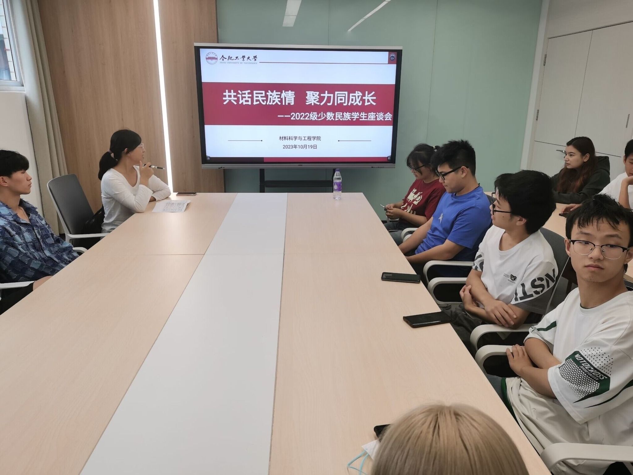 座谈会中,来自9个民族的18位同学一一介绍了个人基本情况、家乡特色、民族特色等,并热情地展示了个人特长。在交流讨论来校一年多的学习生活中,同学们普遍表示在饮食文化、人际交往、学业发展等方面适应良好,对大学学业目标和职业生涯规划有了更为清晰的思路,对一年来的成长经验和下一步目标方向有了更为准确的认知。针对少数民族同学提出的学业职业等方面问题,辅导员一一给予解答指导,并倡导同学们在校期间要铸牢中华民族共同体意识,深入践行守望相助理念,形成互学互助、互爱互敬、共同成长的良好风气;要夯实学科专业知识,充分发挥个人能力专长,提升综合能力素质;要提前做好成长规划,树立积极正确的职业观,以出色的专业本领报效祖国。