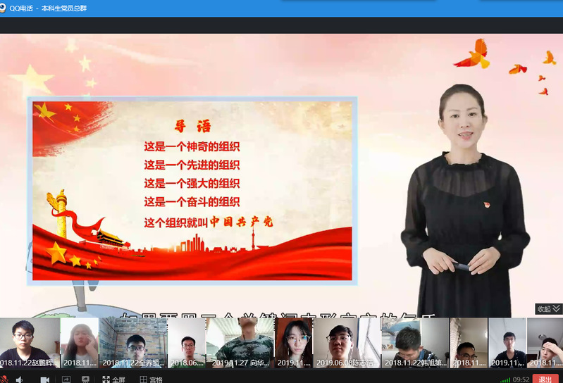 7月1日下午,为庆祝建党99周年,yL23411永利官网登录在本科生党员总群通过QQ群“云”平台开展了题为“在战‘疫’中读懂中国共产党”的线上视频微党课主题学习教育活动,院党委副书记、副院长杨玲老师担任主讲老师,50余名学生党员在线参加。