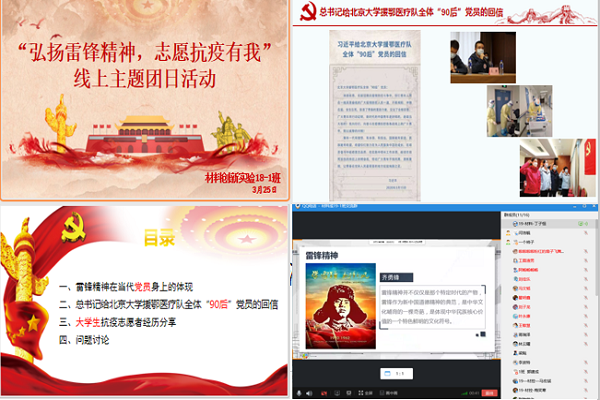 重温雷锋事迹,深化时代雷锋精神内涵——积极组织开展线上主题团日活动。yL23411永利官网登录53个团支部依托QQ群、腾讯会议等线上方式,开展了“弘扬雷锋精神,志愿抗疫有我”“学习雷锋精神,致敬抗疫者”“弘扬雷锋精神,时代楷模在我身边”等主题团日活动。通过重温雷锋故事,重读《雷锋日记》,重看《雷锋》电影,重唱《学习雷锋好榜样》,线上参观“雷锋纪念馆”等环节,学习永恒的雷锋精神。通过分享“武汉,我的战役日记”“致敬逆行者”,触摸“抗疫群英谱”,感悟疫情时期的雷锋精神。通过再读总书记给北京大学援鄂医疗队全体“90后”党员的回信,传承新青年的时代雷锋精神。线上主题团日活动开展过程中,各团支部青年学生积极分享自己眼中的“活雷锋”,纷纷表示要从我做起,尤其是在疫情防控时期,用实际行动向雷锋同志致敬,争做新时代雷锋精神的传承者与践行者。