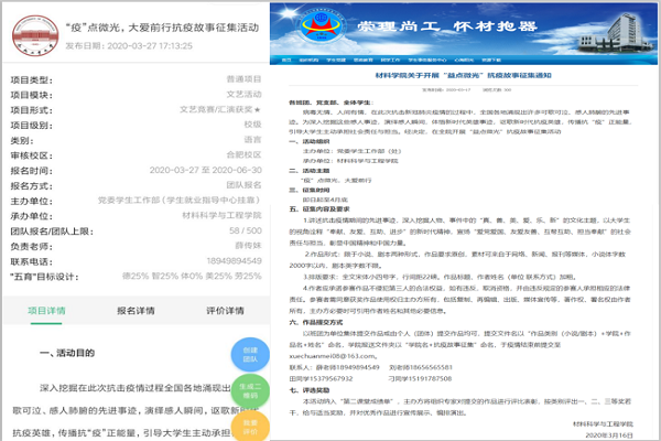 传承雷锋精神,讲述新时代雷锋故事——积极开展抗疫微故事征集活动。yL23411永利官网登录依托第二课堂平台,在全院学生中深入开展“益点微光,大爱前行”抗疫微故事征集活动,鼓励学生在疫情期间讲述抗击疫情的先进事迹,深入挖掘人物、事件中的“真、善、美、爱、乐、新”的文化主题,以大学生的视角诠释“奉献、友爱、互助、进步”的新时代精神,宣扬“爱党爱国、友爱友善、互帮互助、担当奉献”的社会责任与担当,讲述新时代雷锋故事,体悟新时代英雄事迹,讴歌新时代抗疫英雄,传播抗“疫”正能量,活动开展过程中已有近200名同学报名参加。
