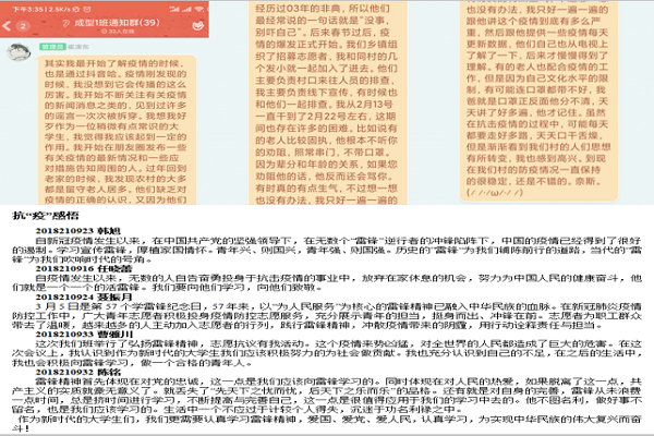 弘扬雷锋精神,强化青春责任勇担——积极宣传青年学子抗疫事迹。自疫情发生以来,学院广大青年团员积极响应上级党组织和团组织的号召,在做好自我防护的同时,在关键时刻挺身而出,用实际行动助力防“疫”,积极投身于家乡疫情防控志愿服务工作,将弘扬和践行雷锋精神融入抗“疫”工作,为打赢疫情防控阻击战贡献青春力量。学院累计有30余名青年志愿者,在全国各地的社区街道、村委会、青年志愿服务点等地,开展疫情防控志愿服务工作,部分同学主动捐款捐物,涌现出吴修佳捐款8000元国家奖学金、孟令孜海外向母校捐赠口罩、金邺诚志愿服务160小时不停歇等先进典型。学院统一部署,积极组织学院志愿者们参与各班团主题班会,开展“志愿抗疫有我”经历分享会,用自身实践体会,现身说法,讲述抗“疫”过程中的身边人身边事。