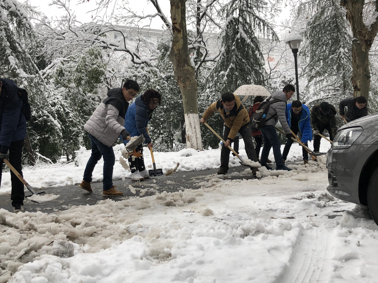 2018年1月5日上午,在辅导员、该支部书记周矗老师的组织下,2015级本科生党支部成员组成义务除雪队,将至善路的积雪铲除干净,为我校师生出行提供便利。