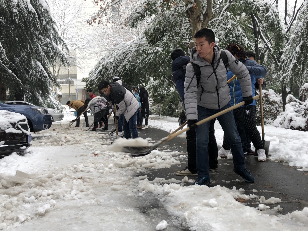 新年伊始,合肥迎来强降雪,工大校园内积雪深厚,严重影响师生出行。雪后第二天,yL23411永利官网登录2015级本科生党支部的学生组成志愿小分队,从行政楼借来工具,火速加入到除雪队伍中去。所有学生分成两组,分别从至善路的两端开始除雪,将路中间的雪堆积到道路两旁,并将停车位前的积雪堆到不妨碍车辆进出的位置。辅导员周矗老师身先士卒,同学生一起劳动,在冰冷的雪地里,同学们丝毫没有怠慢的情绪。经过一个半小时的努力,至善路已经可以正常通车行走。
