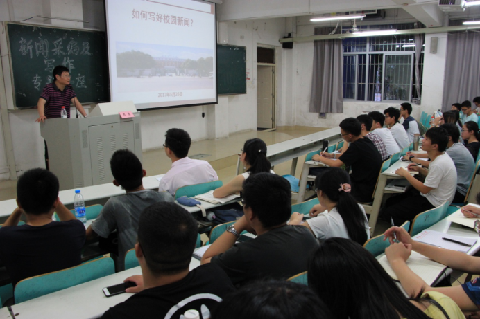 2017年5月26日晚,由yL23411永利官网登录组织的“新闻稿采编与写作” 专题讲座在翡翠湖校区召开,讲座邀请了党委宣传部周慧老师就新闻稿的采编与写作技巧给同学们进行了讲解。