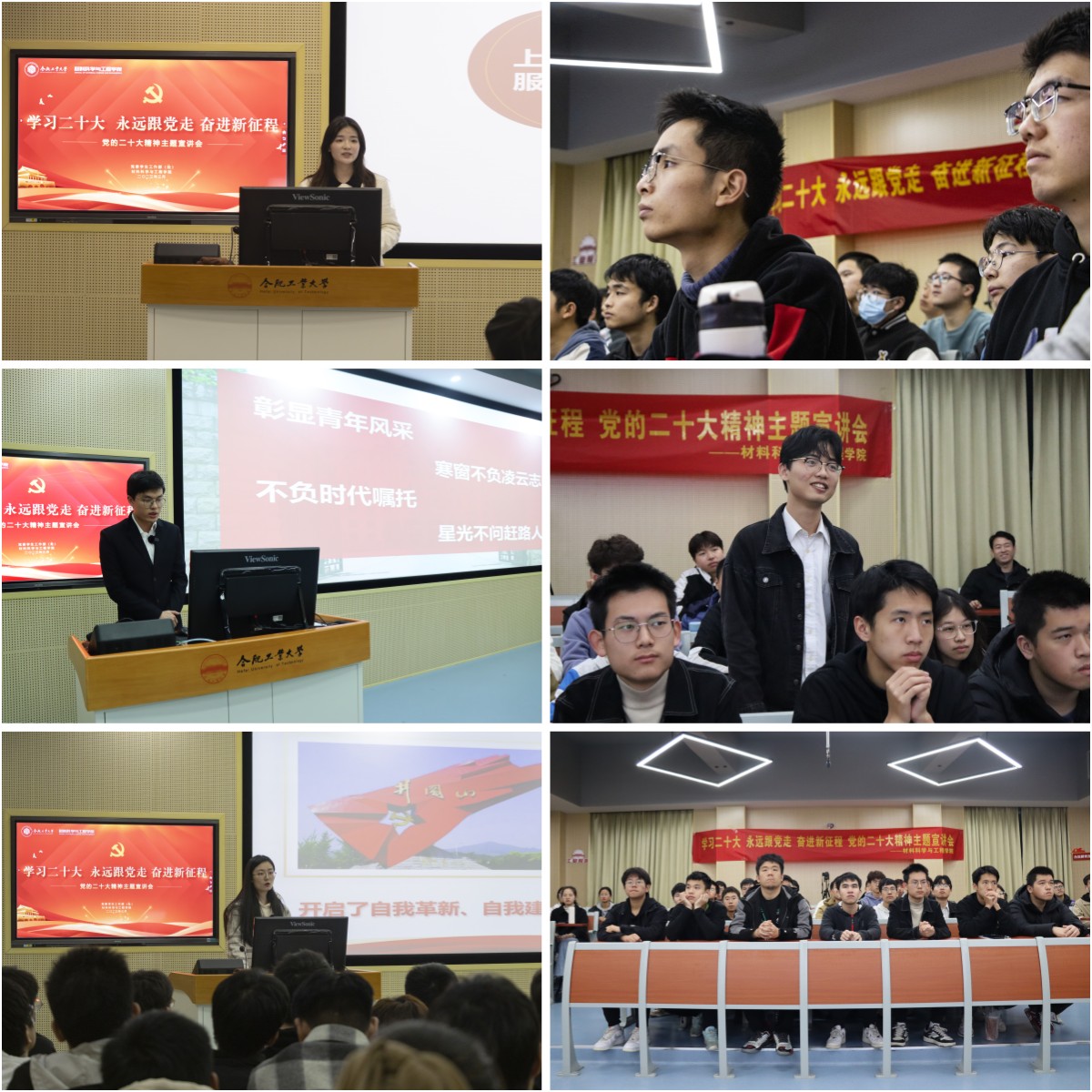宣讲团成员张业成以“勇担使命建新城”为题,围绕青年一代的使命担当展开,当代青年生逢其时,施展才干的舞台无比广阔,实现梦想的前景无比光明。张业成从实际出发,结合自身专业,为同学们阐述了我们工大青年要心怀家国之情,秉承工业报国之志,在新工科建设的道路上贡献自己的青春智慧。宣讲团成员邓煦阳从外语专业特色出发,讲述了中国外交官的故事并以小见大,为同学们讲述了二十大报告中有关“促进世界和平与发展,推动构建人类命运共同体”的重要论述,中国始终坚持维护世界和平、促进共同发展的外交政策宗旨,致力于推动构建人类命运共同体。中国提出了全球发展倡议、全球安全倡议,愿同国际社会一道努力落实。携手开创人类更加美好的未来,同时她也鼓励同学们努力锤炼本领,增长才干,为中国式现代化发展做出自己的贡献。宣讲团成员张小智以“自我革命,敢叫日月换新”为同学们讲述了我们党和国家在百年的风雨兼程中,团结带领各族人民进行自我革命实现中国特色社会主义现代化的历史实例,也从国家层面的自我革命映射到我们同学个人,勉励大家要学习自我革命精神,勇于尝试,并在这个过程中不断进行反思与自我批评,在自我革命中奋发有为。