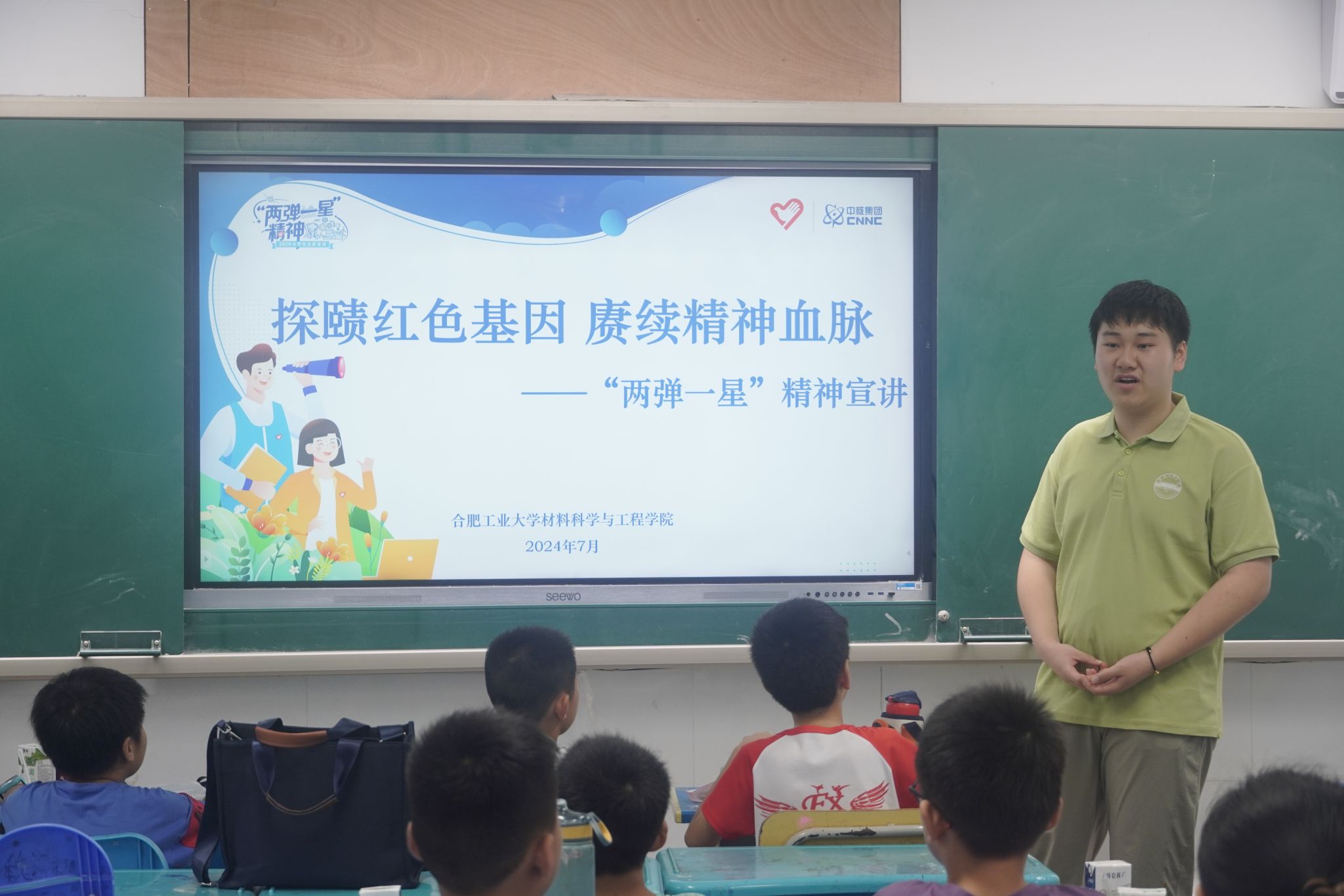 7月13日,yL23411永利官网登录“探赜两弹红色基因,赓续先辈精神血脉”“三下乡”暑期社会实践团队联合yL23411永利官网登录“青春飞扬,筑梦翱翔”大学生志愿支教团队,赴肥西县三河镇政府中心学校开展科普宣讲思政课。课程向学生们普及“两弹一星”精神内涵,引导学生们树立正确的价值观和人生观,厚植爱国情怀。